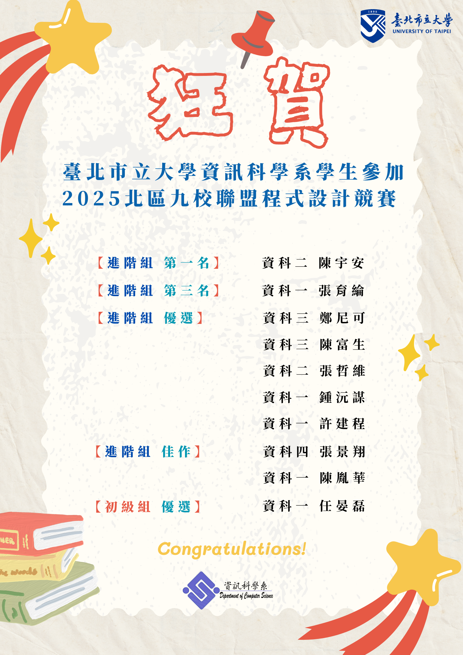【狂賀】臺北市立大學資訊科學系學生參加 2025北區九校聯盟程式設計競賽,榮獲佳績!恭喜獲獎同學喲~~